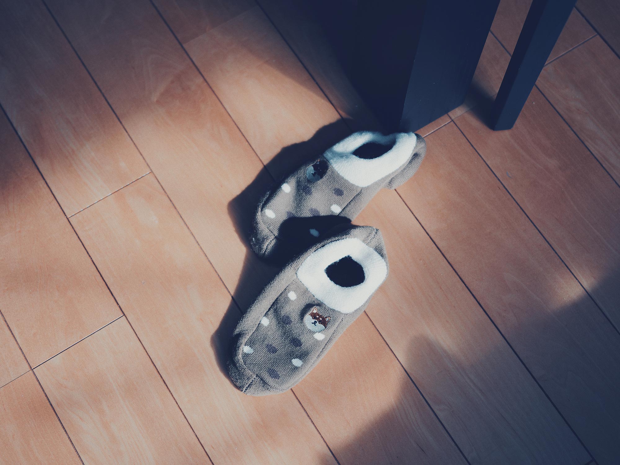 リハビリの日、滑り止めつきの靴下のような履き物が増えていた。理学療法士の方のアドバイスで床にマスキングテープを貼ってみた。