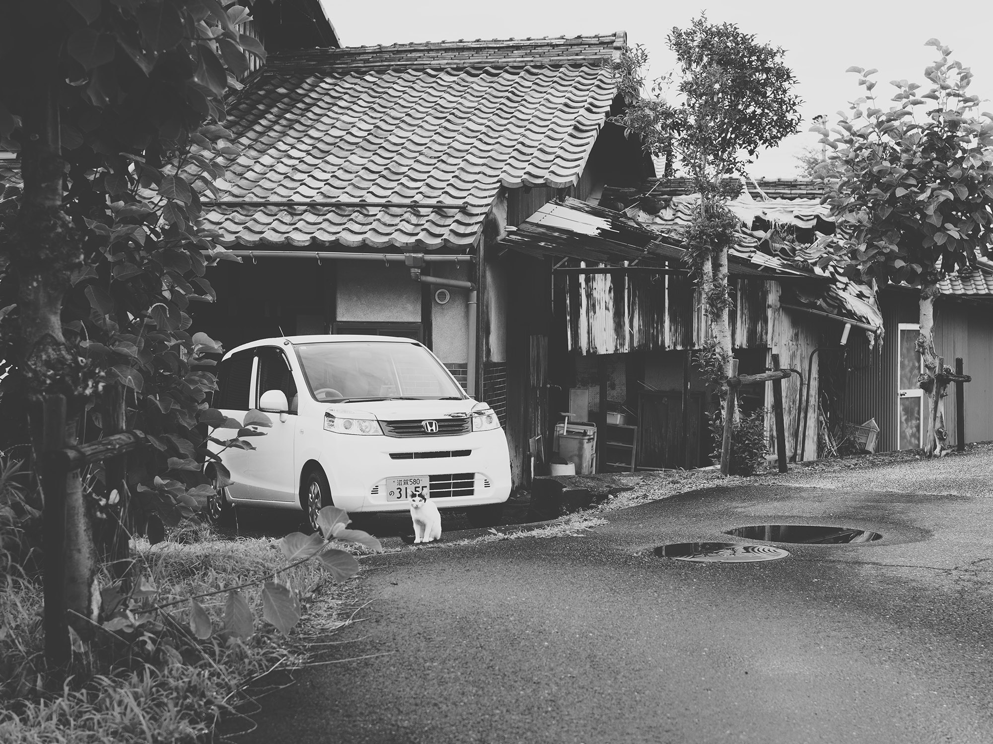 雨上がりにポストへ向かう途中、白い車の前に白い猫ねこさんがすわっていたので撮らせてもらう(最近よく出会うなぁ)。