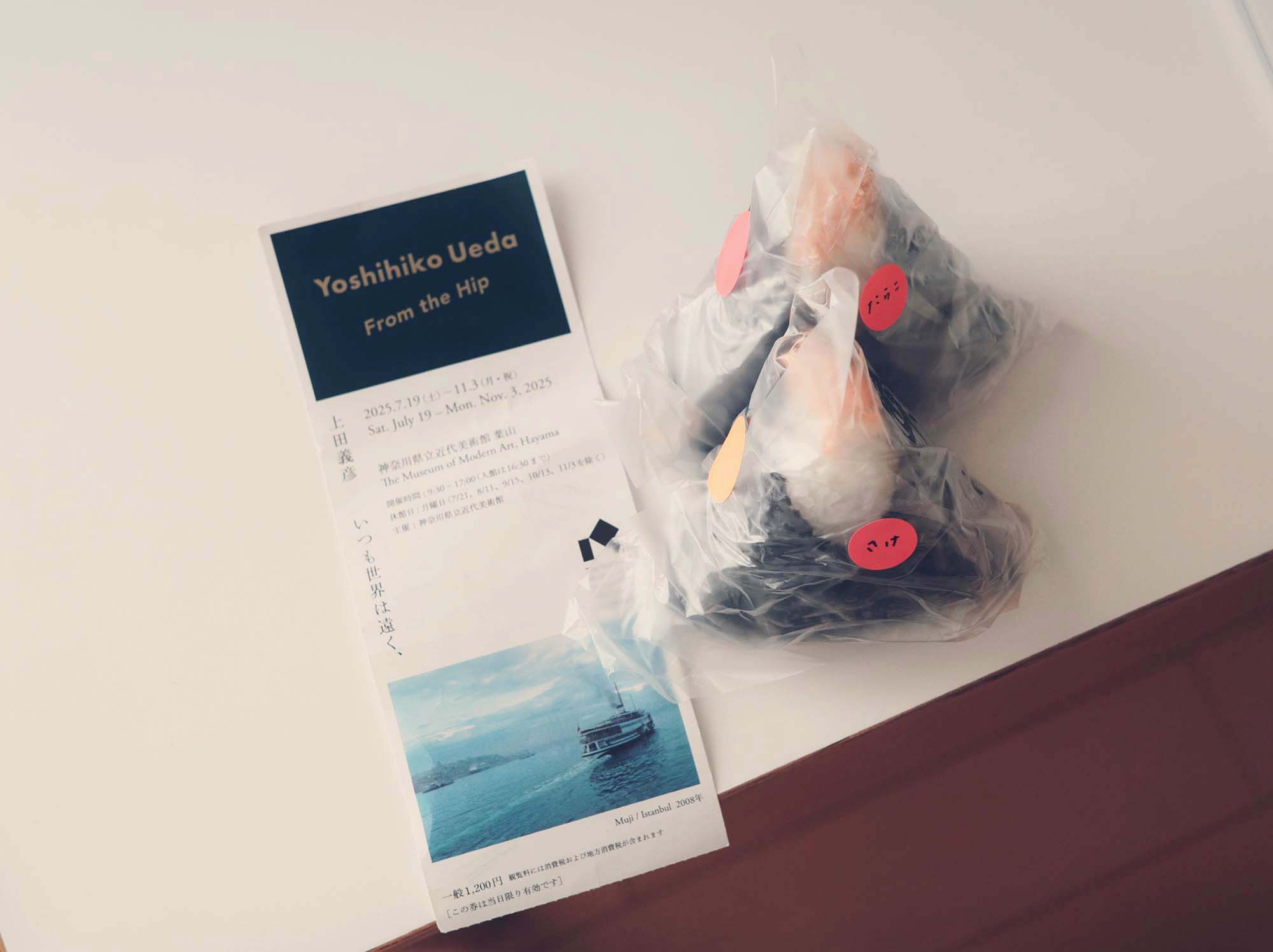 展覧会のチケットとヤムヤムのおにぎりを記念に撮っておいた。わさびツナがお気に入り。