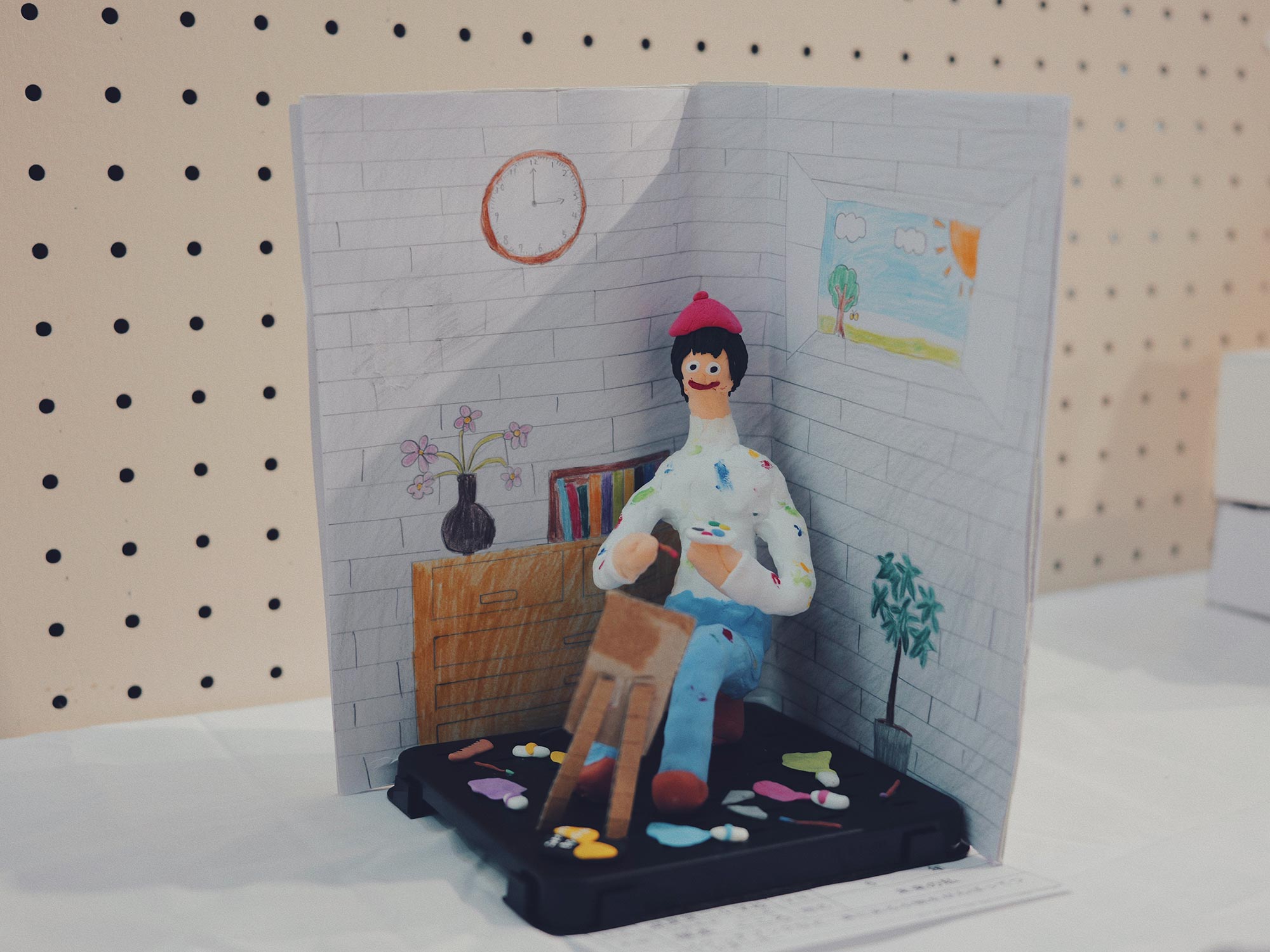一旦帰って展示されているこころさんの作品を見に行く。こころさんらしい作りで面白かった。ミニチュアが好きなだけあって、足元の小物がとても細かい。未来の自分ということらしい。